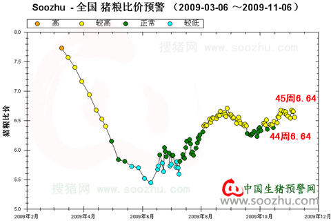 参考此图,据“soozhu-中国生猪市场预警系统”信息显示,本周全国猪粮比价平均值与上周持平,仍为6.64。