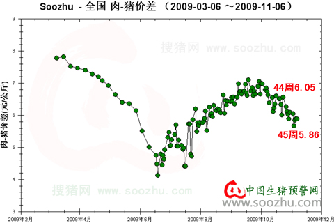 参考此图,据“soozhu-中国生猪市场预警系统”信息显示,本周全国猪料比价平均值为4.58,与上周持平,自35周达4.98后经过10周下跌了近10%。