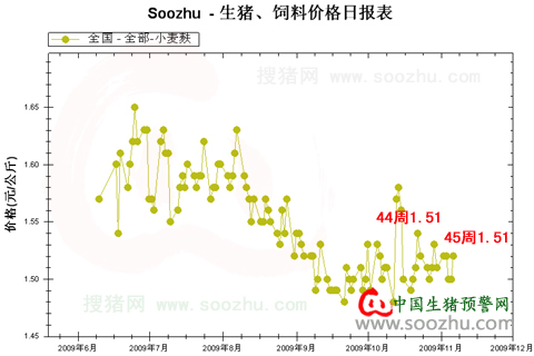 参考此图,据“soozhu-中国生猪市场预警系统”信息显示,本周全国小麦麸平均价格为1.51元/公斤,平稳。预计,受玉米价格的影响,仍有一定的上涨空间。