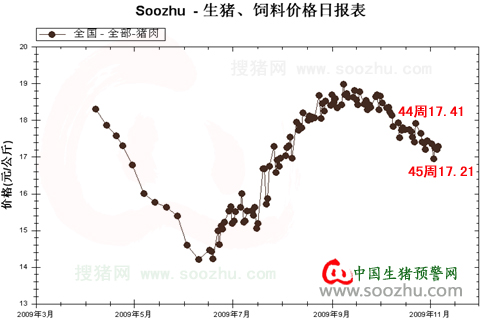 参考此图,据“soozhu-中国生猪市场预警系统”信息显示,本周全国猪肉平均价为17.21元/公斤,较上周回落了0.2元/公斤左右,跌幅较为明显。部分地方病猪量增,及提前出栏导致。