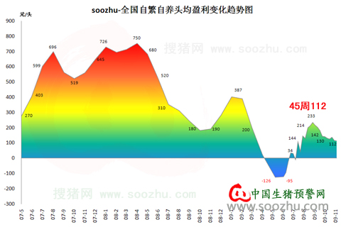 参考全国自繁自养出栏肉猪平均每头盈利变化趋势图,本周出栏头均获利跌至112元/头,较上周下降2元/头,较第35周头均盈利233元/头,已经下跌了121元/头,十周过后盈利下降近一半。