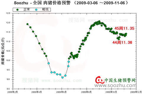 参考此图,据“soozhu-中国生猪市场预警系统”信息显示,本周出栏肉猪价格平均价为11.35元/公斤,平稳。但周末呈现反弹苗头,部分地方猪病过后,存栏有所下降,生猪供应缺口有逐渐扩大的势头,预计价格仍有较大上涨空间.
