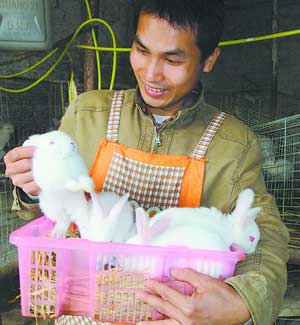 上林县木山乡白境村青年黄恒,两年前到广东江门市一家皮具厂打工,后因金融危机导致皮具厂关门。2008年10月,失去工作的黄恒回到家乡,用打工积攒的1.5万元做资金,开始学习养兔。目前,他的兔场已初具规模,拥有种兔60多只、小兔140只。黄恒说,打工失业并不可怕,可怕的是失去生活的目标,其实,我们每个人身边并不缺少创业机会。图为黄恒和兔场繁殖出的小兔。