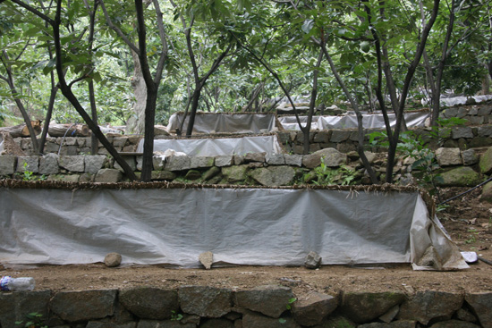树上栗果挂满枝头,树下栗蘑长满蘑棚。走进怀柔区渤海镇六渡河村栗磨一条沟,映入眼帘的是:用泥土草帘和塑料布搭起来的栗磨棚,排列有序的置身于板栗树下。放眼望去,形似小人国的排子房依山而就,它随着沟内梯形坝台的升高而增高,一直伸向大山的深处。栗磨棚的周围缕着数根细长的胶管,伸向一个个集雨池内,总长足有2000延米。一位栗农介绍说:栗磨需要潮湿的生长环境,这些胶管是用来给栗磨补充水分的。
