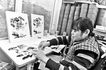 昨天上午,邓秀梅带着花样和蝶翅走进村民芦志真家。几年前,芦志真因车祸残疾,失去劳动能力,邓秀梅就每次把样子和蝶翅送到其家里,做完再来取。昨天,芦志真做的是一幅叫《永定河小渡》的蝶画,花样是邓秀梅根据小时候对永定河的记忆画出来的,做的时候要十分小心,不能破坏蝶翅表面的鳞片和光泽。做一幅这样的蝶画需要两天时间,每幅画芦志真能收入50元,光这一幅作品,芦志真已经做了400多幅。每个月芦志真靠蝶画能增加几百到一千多元收入。