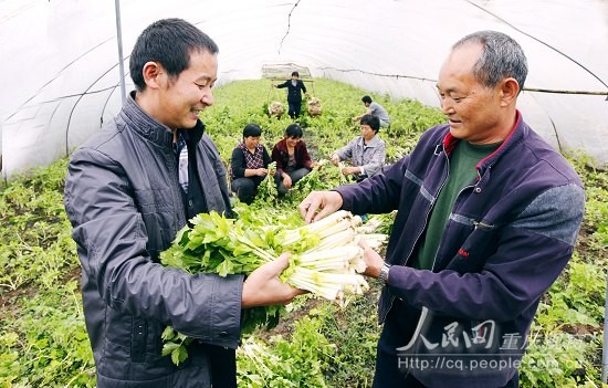 近年来,铜梁县小林镇计生协会通过开展送政策、送信息,送项目、送资金、送农资配套服务,帮助30多户计生贫困户发展起了种植养植加工产业脱贫致富。图为镇计生干部在圣灯村计生户叶志勇的反季芹菜大棚里了解销售情况。