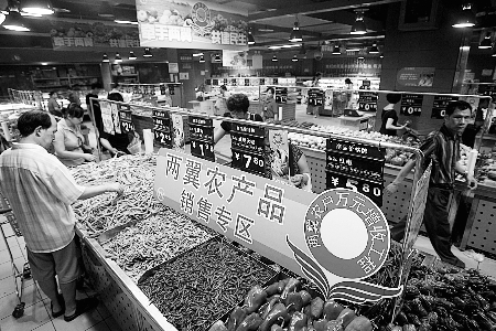 市民在超市的两翼农产品销售专区选购蔬菜。