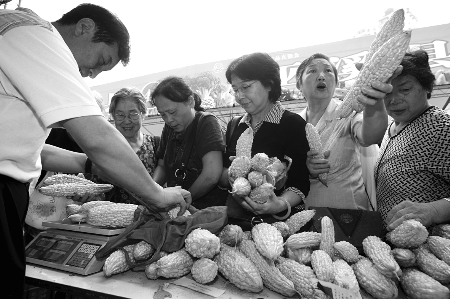 市民在两翼地区农产品直销会选购万州出产的苦瓜。