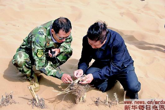 ▲2015年6月6日,林占熺(右)在内蒙古磴口柳拐沙头指导菌草防沙固沙。