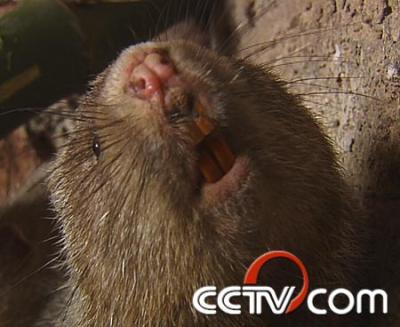 这是一种爱吃竹子的啮齿鼠,学名叫竹鼠,在北方地区,人们又把它叫做竹狸。2008年4月15号,记者到广西壮族自治区桂林市荔浦县拍摄的时候,为了让观众近距离看清楚竹鼠,养殖户特意把竹鼠放到了一个宽敞的室内进行拍摄,却没想到这个举动还原了竹鼠的本性。