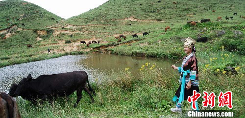 7月13日,广西柳州市融水县杆洞乡一位苗族姑娘在深山里放牧。近两年,居住在融水县大山里的少数民族通过成立合作社,在当地扶贫部门的帮助下,购买良种黄牛和改良草场,逐步扩大养殖规模,脱贫致富。