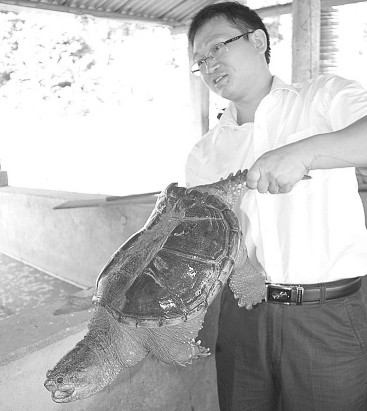 在基地的养殖池,毛周生捞出几只鳄鱼龟给我们看。其中最大的那只鳄鱼龟大概有30斤。据介绍,这样重量的龟市场价为80元一斤。目前,养殖池存有这种大龟20多只,养殖时间都在3年以上。