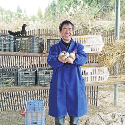 戴金平展示他林下养鸡产的生态绿壳鸡蛋