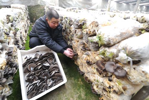 1月16日,河北霸州马坊村平菇种植合作社农民在采摘蘑菇 。 新华社记者 李晓果 摄