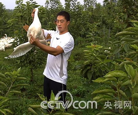 苗木经销商闫洪亮:原先农村都是在家庭养个三只,二只,十只八只的,一到这里一看成群结队的,很壮观。地上全是鹅,走到哪儿鹅跟到哪儿,吃到哪儿。