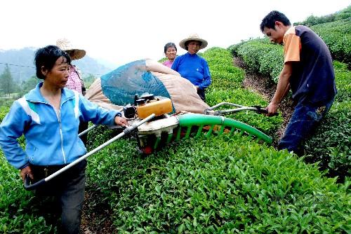 核心提示:5月3日,婺源茶农用采茶机在茶园采摘茶叶。 今年春茶采摘期间,江西省婺源县倡导茶叶机械化采摘,并出台采茶机购置惠农补贴政策。据介绍,引进采茶机可以缓解当地茶叶采摘季节劳力的紧张,并提高茶叶采摘效率。 新华社发(王国红 摄) 5月3日,婺源茶农用采茶机