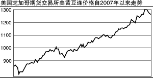 2006年10月以来,国际大豆价格持续快速上涨,直到突破历史最高价,中间没有调整。上一交易日,美豆指数以1298收盘,仍然保持强势,处历史最高价位区间。从2007年10月至2008年年初,美豆指数在短短两个月内,翻了一倍。
