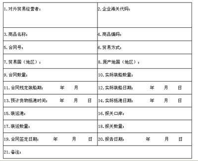 第六条 对外贸易经营者应填报《大宗农产品进口报告统计报表》(格式见附件),报告事项主要包括:对外贸易经营者、联系人、联系方式、商品名称、商品编码、贸易方式、贸易国(地区)、原产地国(地区)、合同号、合同数量、合同船期、装运港、预计抵港时间、实际船期、装船数量、进口报关口岸、进口数量和实际抵港日期等。