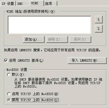 知道了其真实原因后,解决起来就方便多了,我们只需要取消NetBT方式,强制使用Direct hosting即可。打开本地连接的属性窗口,双击其中的“Internet协议(TCP/IP)”,在打开的窗口中单击“高级”按钮,再切换到“WINS”选项卡,将其中的“NetBIOS设置”设为“禁用TCP/IP上的NetBIOS”选项,然后单击“确定”按钮保存设置就可以了(图1)。