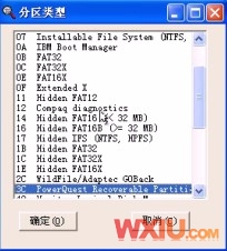 3、随即弹出“分区类型”双扣,在下方列表框中所选的是“3C PowerQuest Recoverable Partition”选项,其缩写正是“PqRP”。