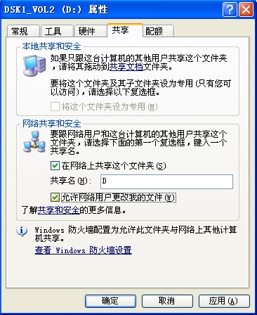 6.在弹出菜单中,勾选“在网络上共享这个文件夹”,共享名可以任意更改成您想要的名字,同时如果您需要局域网中的其他计算机更改您的文件请将“允许网络用户更改我的文件”,否则该共享盘符或文件夹为“只读状态”,假如您需要共享的仅仅是某个盘符下的文件夹,方法与盘符共享相同,最后点击“确定”