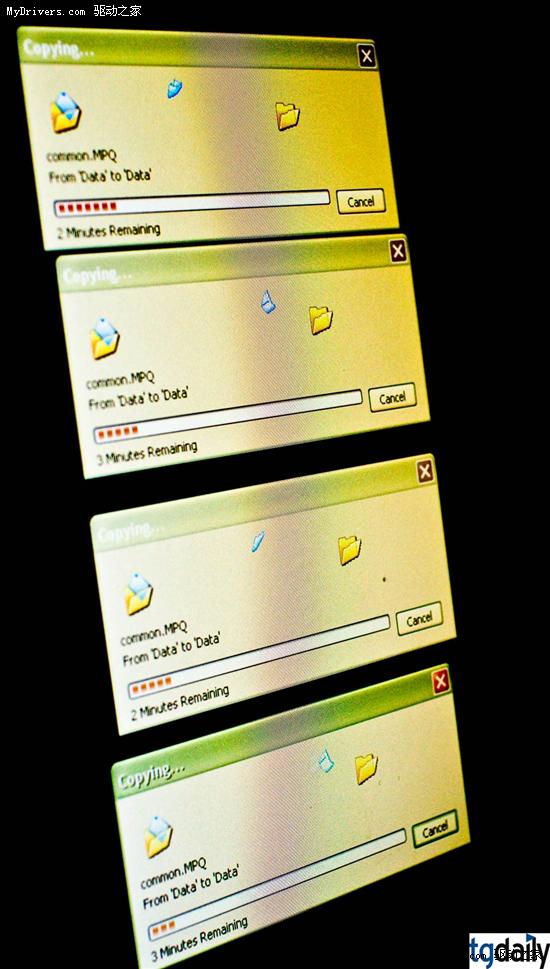 TGDaily的编辑随身带着一块西部数据My Passport移动硬盘,里边恰好就有《魔兽世界》,把8.5GB左右的程序文件夹拷贝过去就是了。这一过程耗时6分钟,完成后再在ioXtreme内部复制四份,而且是同时进行,结果总计34GB文件不到两分钟就搞定了。