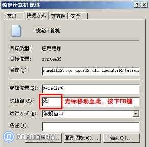 第三步:在桌面找到并使用鼠标右键点击刚才创建的“锁定计算机”快捷方式――>选择“属性”――>切换到“快捷方式”选项卡中――>将鼠标点击 “快捷键(K)”中的“无”,将光标移动到“无”后面――>按下F8键,快捷键即设置为F8键了――>点击“确定”退出;
