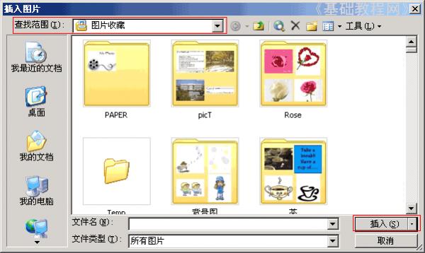 3)出来一个“插入图片”的对话框,点上边的“查找范围”找到自己的图片文件夹,然后在中间选择一个图片,点“插入”即可;