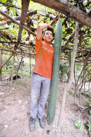 核心提示: 南岸区广阳镇新六村一家院坝,一个玩意让73岁村民何国荣喜忧参半:一株冬瓜秧结出的“冬瓜”,从上到下裹青皮,始终保持直径约20厘米,模样像棒槌。