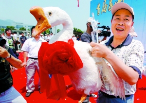 5月28日,在浙江象山县人民广场举行的鹅王擂台赛上,一只8.7公斤重的大白鹅最终获得鹅王桂冠。 当日,首届象山·浙东白鹅节在浙江宁波市象山县举行,妙趣横生的鹅王擂台赛、美味诱人的白鹅烹饪大赛让市民大开眼界。 新华社发