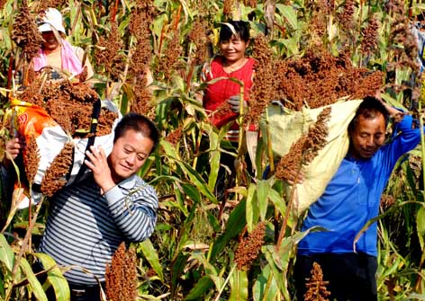 农民们正在采收高粱穗