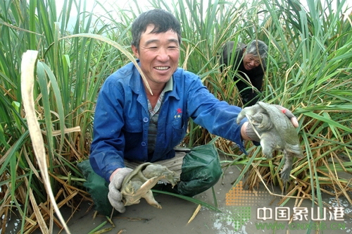 浙江省宁波市象山县晓塘乡月楼茭白专业合作社养在茭白田里的甲鱼陆续上市。前几天,泗洲头一家农家乐以每公斤300元的价格购买了8只甲鱼。农家乐负责人说:“我先后已在这里买了20多只甲鱼。它的味道与野生甲鱼相近。”