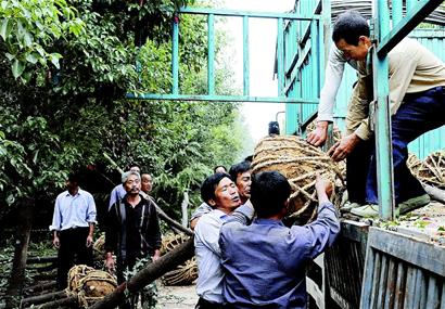 16日,襄樊客商到沙洋县纪山镇花卉苗木基地收购樟树。近年来,该镇大力发展绿色产业,近千农户参与花卉苗木种植,面积达到8000亩,花卉苗木远销成都、重庆、上海、苏州等地,户均收入3万元以上。