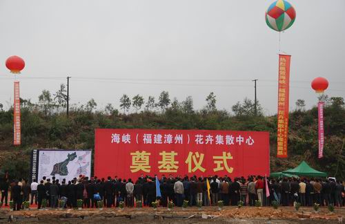 在首届海峡两岸现代农业博览会暨第十一届海峡两岸花博会即将开幕前夕,11月16日,总投资3亿元、占地2000亩、总建筑面积43万平方米的海峡(福建漳州)花卉集散中心,在漳浦台湾农民创业园举行隆重的开工奠基仪式。这是漳浦县当天开工竣工、总投资18.86亿元的44个项目之一。