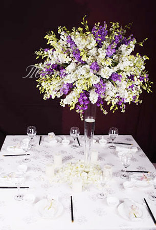 紫韵怡人主桌花:紫罗兰与金鱼草的巧妙融合,如一对新人相互依偎、如胶似漆般甜蜜。