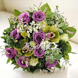 紫韵怡人捧花:俏丽的紫精灵玫瑰,仿佛听到新娘携手相随的愿望,爱的感动散播四方。