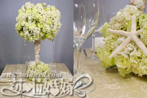 6、婚桌上的花艺取材绣球,海星和贝壳是提升花艺品味的亮点。