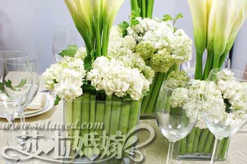 1、马蹄莲与绣球的组合设计,搭配透明的玻璃餐具,营造清新的视觉空间。