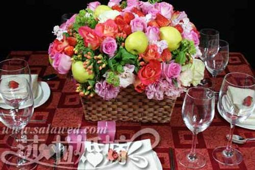 2、整个婚桌协调统一,颜色上活泼艳丽,建议:使用简洁的餐具,为了使婚桌看起来精致而不繁冗。