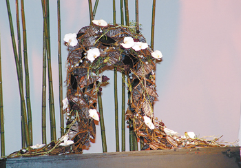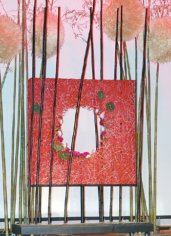 这就是2006年5月2日,朱永安在上海“花之韵”插花艺术展上做的专场表演,惊喜,震撼,叹服,期待,一种极具个性的花艺表演舞台风格征服了观众。“低调奢华风”是朱永安这一场表演带给观众的第一个设计概念———“时尚的潮流永远不停歇,在禅风之后,我们迎来的是低调奢华风”。一个形如字母“n”的大型作品初看之下平实无华,但细节处却让人惊叹———精细繁复的编织将无数椭圆型单片集结成空间感很强的整体,皮革的应用切合了当下的时尚之风,内敛的深棕色搭配同色系的花材,浑然一体,只留几朵纯白的蝴蝶兰跳跃其间。这种抖落外在的华丽,力求表现一种沉淀后的神秘奢华,正是花艺师要传达给观众的。之后是“新艺术的生命力”、“简约之美”、“东方调的内蕴”等一系列精彩作品和概念。花艺师在强调设计的同时,也在时时传达着一种东方美,有民族特色的植物(竹、芍药、油菜),与西式花艺技巧、手法的结合;硬朗的钢材与柔美的洋兰,黑与红的映衬对比……都诠释着花艺师心中“东方前卫”的概念。