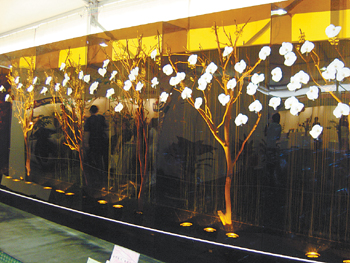 一直以为提出古典与现代这一命题的,一定是略有年纪的花艺师,没想到,朱永安先生竟如此年轻随和,于是,我迫不及待地把话题引向了这次的展位设计。朱永安告诉我,这一设计理念来自眼下流行的新古典主义的低调奢华风。至于整个设计的表现形式则是从一片简单的亚克力片开始的———“我发现,这些亚克力片可以组成很漂亮的花朵,于是希望能用做设计,然后想到了树干、灯光、白色蝴蝶兰,为了让设计的表现不那么写实,我选用了咖啡色的玻璃作为遮挡,增加作品的神秘感……”朱永安谈起花艺创作来,可谓是兴致盎然,神采飞扬。