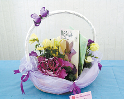 评委王绍仪点评:作品最主要的特征是清雅,适合做礼品。花篮中放的是两本花艺书籍,很有新意。书的体量在作品中构图比例适中且能突出主题。花篮也非常便于提携,较为实用。整体色彩柔和,尤其是篮子部分进行了精美装饰。作品整体线条流畅,焦点突出。