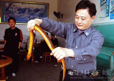 “黄鳝被人拿来后,我们都吓了一跳。”辣子村鱼庄厨师魏强说,24日早上有人给打来电话说23日晚在底蓬镇东风水库抓到一条大黄鳝。当时并没引起注意,只是让人拿到鱼庄后再说,后来才发现,这条红色的黄鳝实在太大了。
