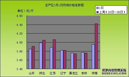 3月1日全国大部分地区肉鸡购平均价格3.85元/斤,较上周相比回落6分。近日全国两大产区肉鸡价格走势有所不同,其中东北产区肉鸡价格以稳定为主;华北产区肉鸡价格略有下降,与上周平均价格相比,河南地区肉鸡价格出现大幅下跌。具体的详细信息如下: