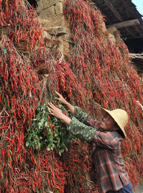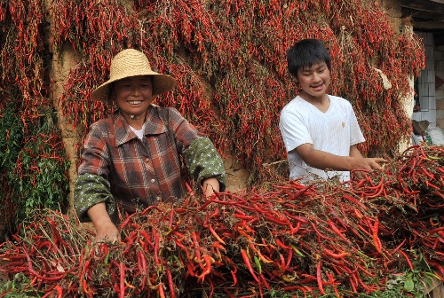 砚山(云南),2009年8月8日 辣椒红了 8月8日,砚山县维摩乡的辣椒种植户正在晾晒刚采摘的新鲜辣椒。