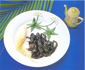用料:哈士蟆12只 人参10g 酱油 精盐 味精 白糖 料酒 高汤 湿淀粉 葱 姜