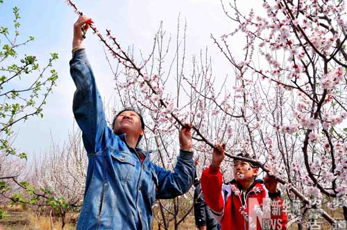 艳阳五月,中国北方内蒙古大兴安岭山脚下的扎兰屯市一片繁忙景象,万亩果树林百花绽放,果农抓住花期季节修剪枝叶,进行人工授粉,提高坐果率。
