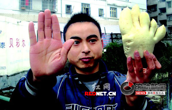 记者看到,这个萝卜的下端五根“手指头”栩栩如生,大拇指、食指、中指、无名指和小指头一应俱全,整齐地排列着,几乎跟人的五根手指头“一模一样”。