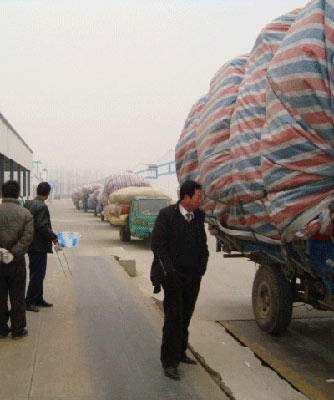 满载棉花的农用车排起了“长龙”。