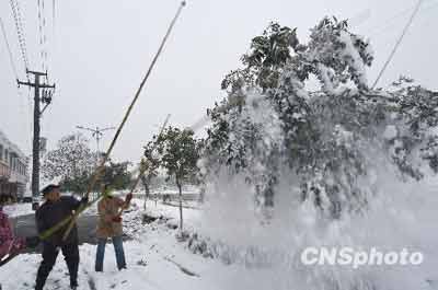 2009年11月12日下午,济南市平阴县园林工人清理街道两侧树木积雪,为树木减负,确保减少暴雪给园林树木带来的灾害。